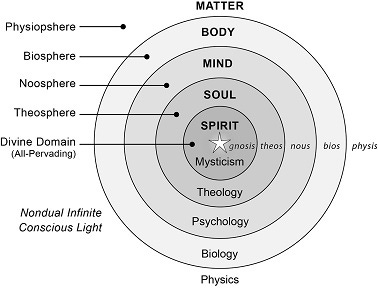 This forms the Great Chain of Being—but since it is not purely a linear process, it is rather a Great Nest of Being. Like a flower blossoming, the levels of existence blossom from the material level to the body, to the mind, to the soul, to the spirit, each nested within and including the levels below it.